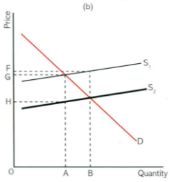 图(b)中,supply curve非常的elastic,同样的均衡价格从OG降到OH,均衡价格下降很多,subsidy的政策福利很多都落实到了consumer手里。