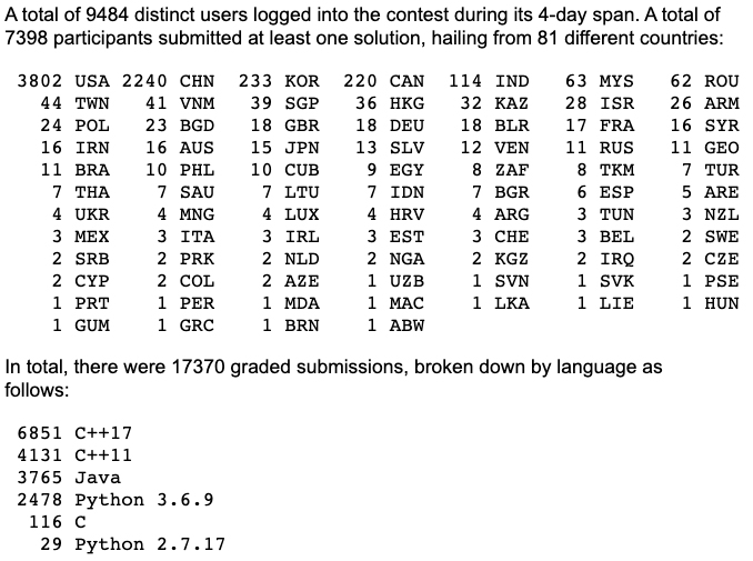 结果详情页面的最上端显示了此次竞赛的总参赛人数,参赛者所属的国家,以及各个参赛者所使用的编程语言统计,如下所示: