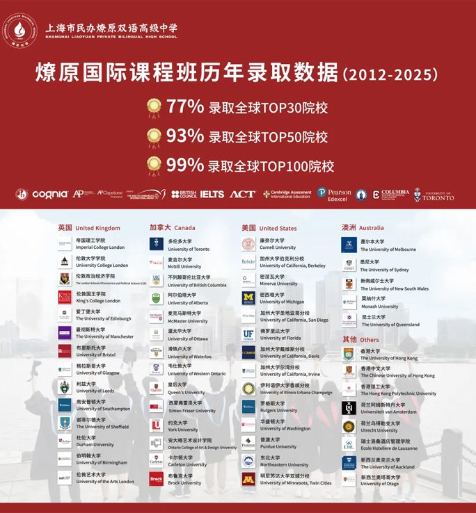 燎原高中国际课程班历届毕业生,77%录取世界前30大学,93%录取世界前50大学,99%录取世界前100大学。