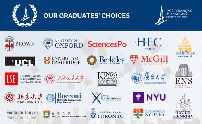 上海法国外籍人员子女学校在上海有两个校区,就读的学生来自45个国家,涵盖幼儿园到高三的所有年级。三语教学(法语,英语和汉语)是本校日常生活不可分割的一部分。语言学习融入多种课程项目中,根据每一位学生的需求(中国国际班以及美国国际班)进行调整。本校还为不讲法语的学生量身定制了法语课程。自2015年开始,本校法国高中毕业会考的成功率达到100%!能够获得如此佳绩,是因为我们认真关注每一位学生的进度,是因为教学团队为每一个学生的升学而不懈努力地付出。我们的学生考入了世界顶尖大学继续深造。