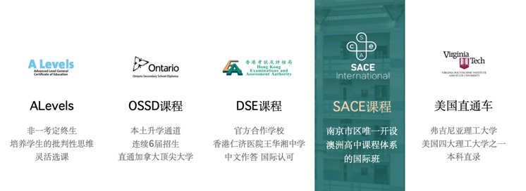 南师大附校国际部EPD提供四大课程体系与中美直通车项目供学生选择,包括SACE课程、OSSD课程、A-level课程、DSE课程、美国弗吉尼亚理工大学直通车项目。