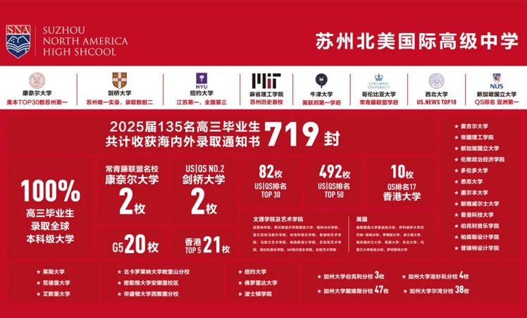 苏州北美国际高级中学在近三届毕业生中持续取得突破性升学成果,展现出强劲的全球顶尖名校录取实力。不仅在2023年诞生了苏州首位斩获麻省理工学院(MIT)本科录取的学子,更连续多年收获包括剑桥大学、康奈尔大学、西北大学在内的英美顶尖高校录取,彰显了在高端人才培养上的卓越竞争力。