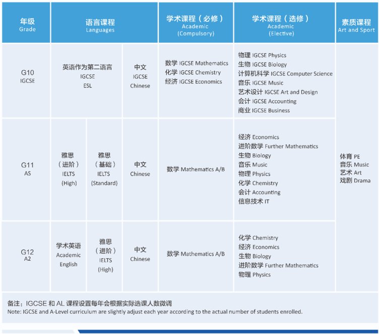 CBS高中部开设英式国际高中课程,学生在3年的学习中完成IGCSE和A Level课程。A Level课程注重学科专精,特别适合专业方向明确的学生。