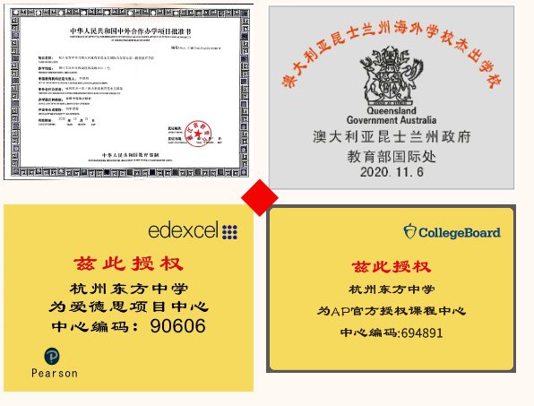 杭州东方中学国际部 2012 年经省教育厅批准设立,是浙江省首批中外合作办学资质的办学单位,秉持 “厚东方文化底蕴,纳世界教育精华” 办学理念,以培养“具有民族情怀与国际视野的世界公民”为使命。国际部开设澳洲QCE课程、QCE&A-Level融合课程和QCE&AP融合课程,课程均获官方授权,学生可注册双学籍,凭借任一课程成绩可全球申请。