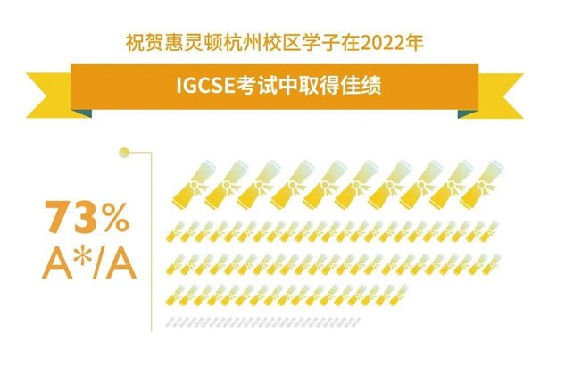 惠灵顿杭州校区学生以优异的成绩在多所世界顶尖学校学生中脱颖而出。在我校学生的成绩中,A*-C的占比为93%,远超英国本土学校的平均成绩——A*-C占比73%。相信在不久的将来,杭州校区的首批高中部学生也将纷纷进入世界顶尖大学,交出优异答卷。