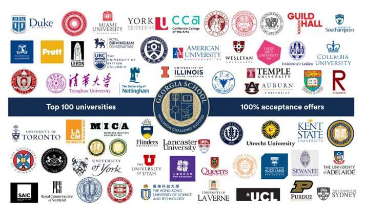 迄今为止,我校毕业生已收到包括约翰.霍普金斯、哥伦比亚大学、杜克大学、加州伯克利、圣路易斯华盛顿、南加利福尼亚大学、纽约大学、帝国理工、伦敦大学学院、加州大学戴维斯分校、早稻田大学、清华大学、北京大学、香港大学、多伦多大学、南洋理工大学、悉尼大学、墨尔本大学、伯克利音乐学院、普瑞特艺术学院、芝加哥艺术学院等全球排名前30的顶尖大学录取通知书。