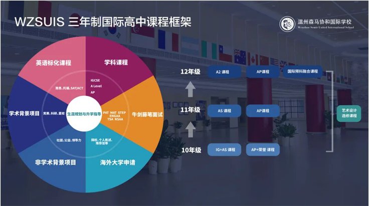 温州森马协和学校高中部提供AP和A-Level两大国际金牌课程,并辅以艺术设计特色选修课程。WZSUIS高中部以“牛剑藤”为指引,聚焦过程管理,为学生制定精准的升学方案和执行计划。
