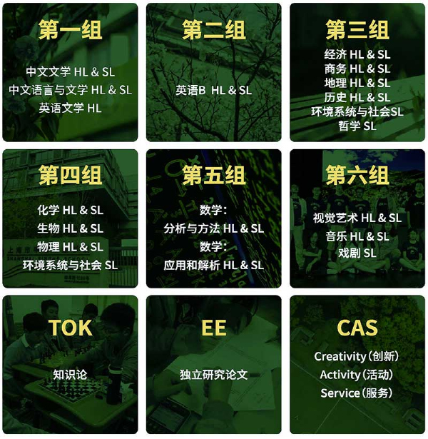在为期两年的IBDP课程中,学校使用7分制和A-E评分系统。IBDP课程包含六个学科组和三门核心课程。六个学科组提供的课程包括中文语言与文学、中文文学、英语、经济、地理、历史、哲学、物理、化学、环境系统与社会、数学、视觉艺术、戏剧等。三门核心课程为知识论、拓展论文和CAS,知识论和拓展论文评分为A-E。以下是开设的IB课程: