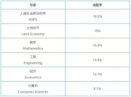 在中国学生申请的热门学科中,录取率最高的理工科是自然科学(Natural Sciences),录取率高达21.8%,录取率最高的人文社科是历史(34.3%)、地理(33%)与教育(31.4%)。其他热门学科的录取率如下: