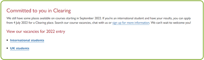 本科补录今年大多数课程都进入到了Clearing阶段,详细信息可在下面链接中查看:https://www.birmingham.ac.uk/undergraduate/clearing-adjustment/international/Clearing-International.aspx#CourseComplete_AtoZTab