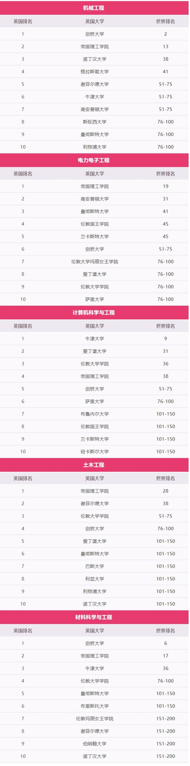 机械工程——剑桥(2),帝国理工学院(13),诺丁汉(38),格拉斯哥(41)