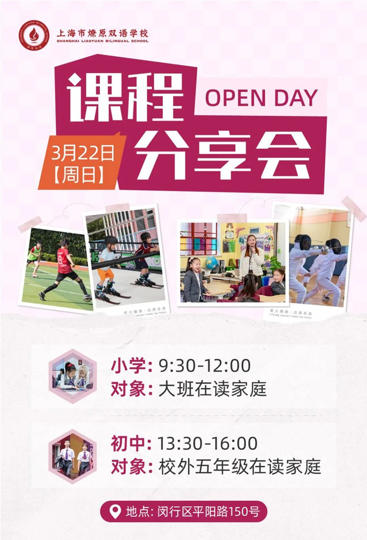 【讲座主题】:上海燎原双语小初课程 3月22日开放日,欢迎预约报名