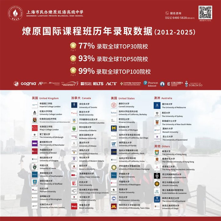 高中国际课程班历届毕业生77%录取世界前30大学,93%录取世界前50大学,99%录取世界前100大学。