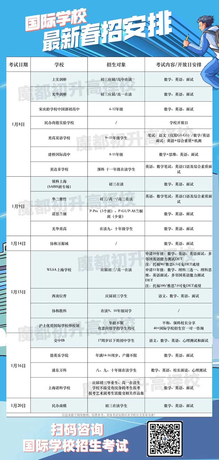 上实、光剑、领科、WLSA上海、交中IB等头部学校在1月份仍旧会安排春招考试,赶上春节前的春招末班车,来看看本周末开考情况吧!